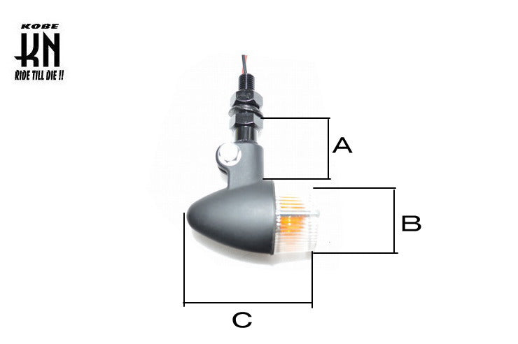 配線の先端は。 【バルブ】 ウインカーバルブ 12V23W/8W 23W→ウインカー 8W→ポジション としてお使いください。 ※日本規格のバルブです。 【配線】 ■付属ウインカー配線長さは500mm ■一般的なギボシ端子になっております ■延長がご希望の場合は WE08を同時にご購入ください。 【サイズ】 A=33mm B=35mm C=70mm